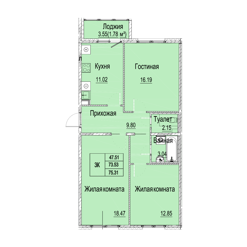 3-комнатная 75.69 м2