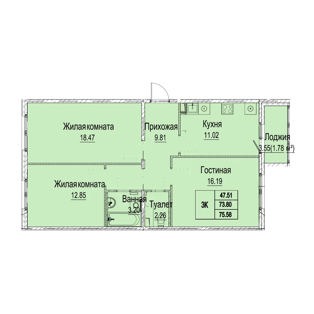 3-комнатная  75.06 м2
